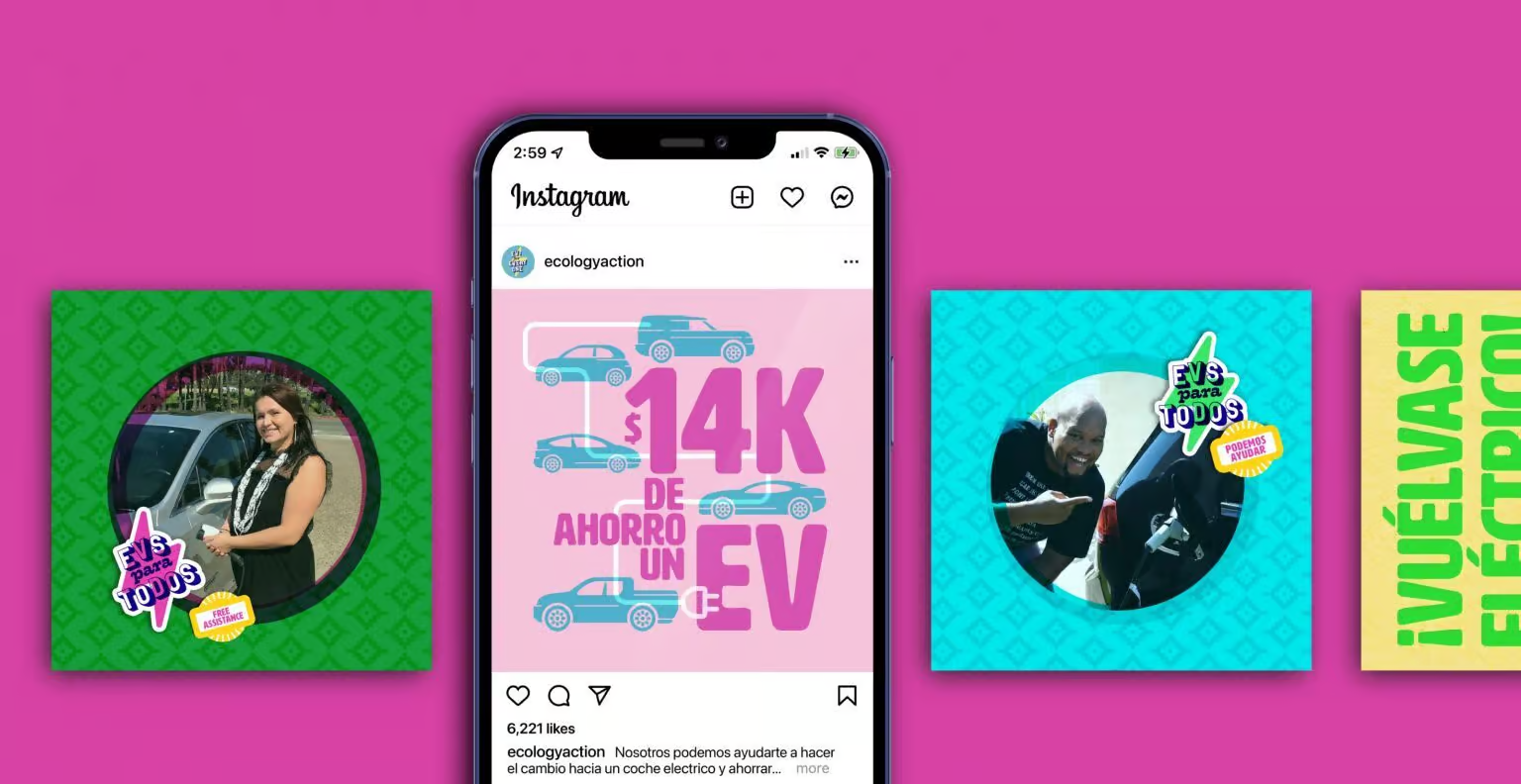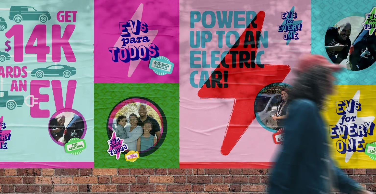 I led a Spanish-first transcreation approach shaped by cultural research and input from bicultural consultants. Rather than translate English messaging, we rebuilt it from the ground up around a clear, human idea: electric cars can work for your life and your budget. That clarity inspired the theme “EVs para Todos.” Visually, we created a fresh, youthful identity grounded in California Latinx aesthetics—bright, optimistic, and easy to recognize in digital channels. When the pandemic shut down all planned in-person outreach, we shifted the campaign to webinars, social content, and ambassador-led digital engagement. Once restrictions eased, we expanded the system into event materials, including branded tents, signage, apparel, and kits for community activations.